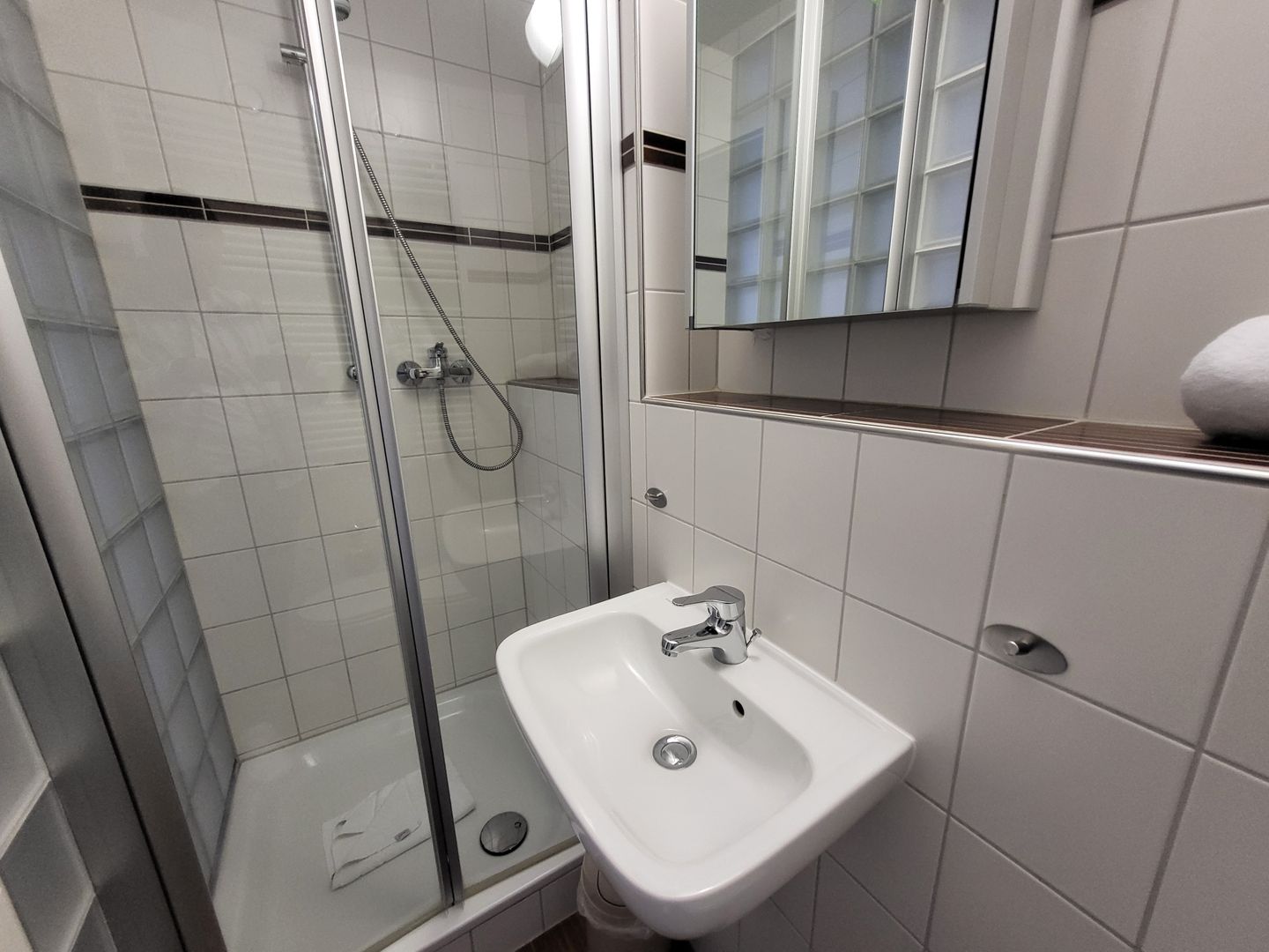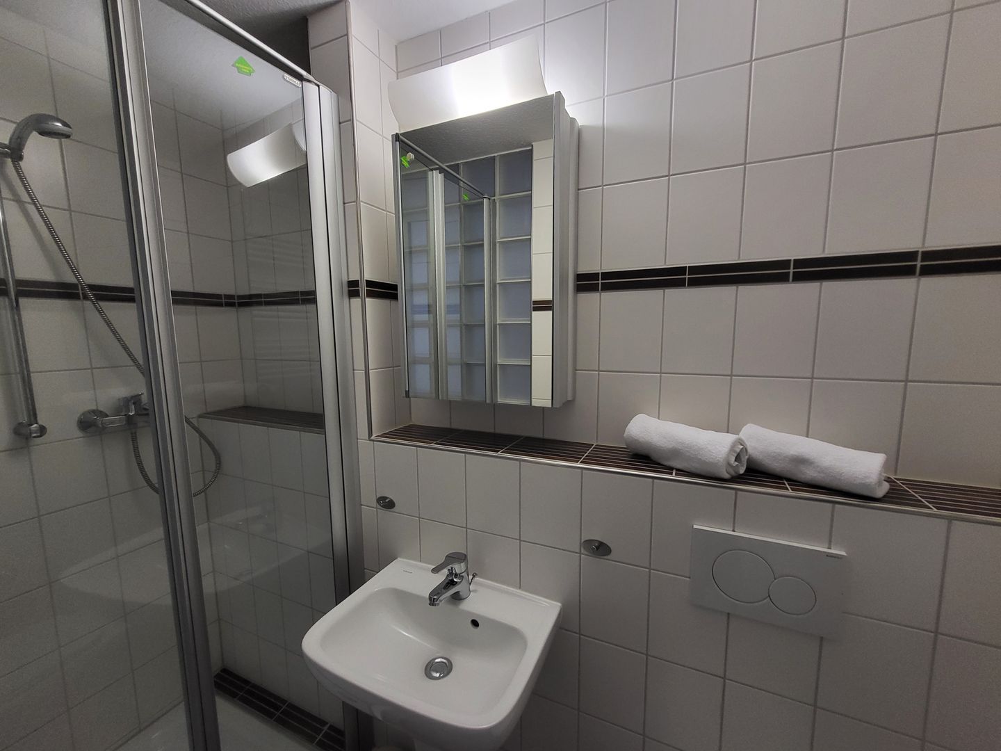 Das moderne Badezimmer verfügt über eine Dusche mit Duschtasse, Waschbecken, Spiegel und WC.