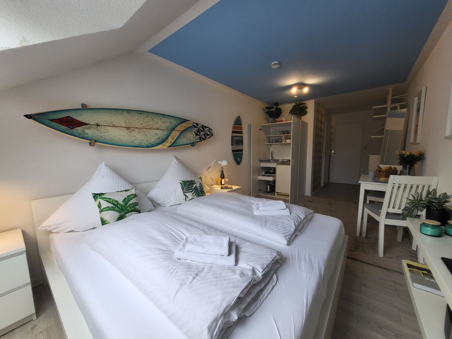 Im modern gestalteten Wohn- und Schlafraum befindet sich komfortables Doppelbett, der Esstisch sowie die in den Raum integrierte Küche. Eine Garderobe und ein Schuhschrank sorgen für zusätzlichen Komfort.
