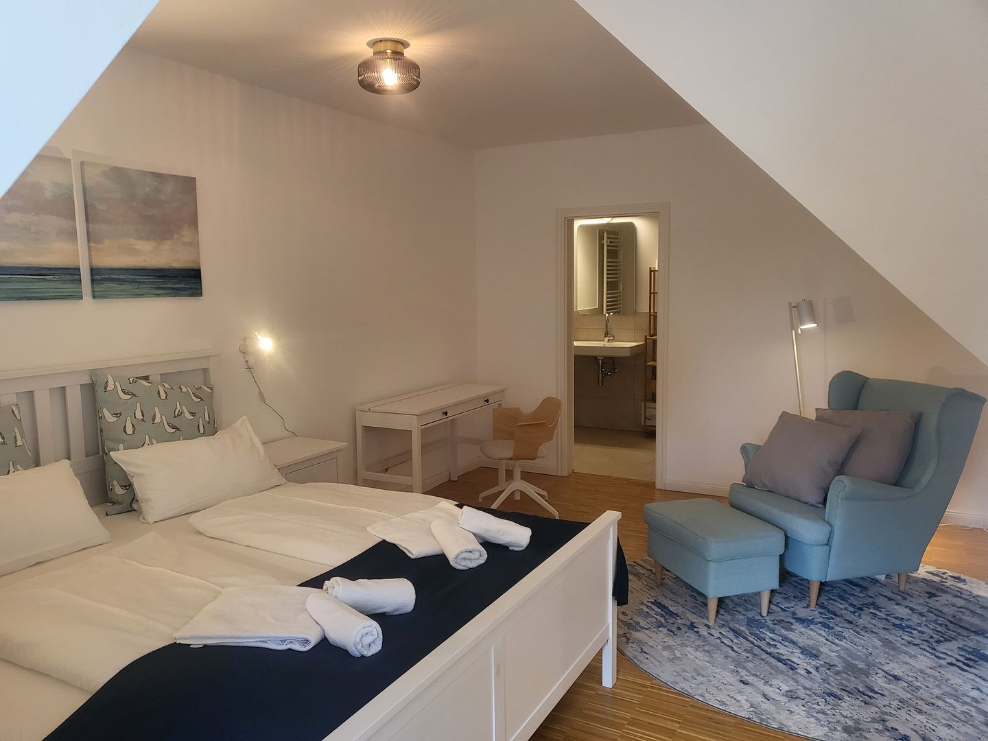 Im ruhigen, hinteren Teil des Gebäudes liegen 6 Ferienwohnungen. Zu Fuß oder mit dem Fahrrad sind der Ortsteil Dorf und der Böhler Sandstrand wunderbar zu erreichen.
