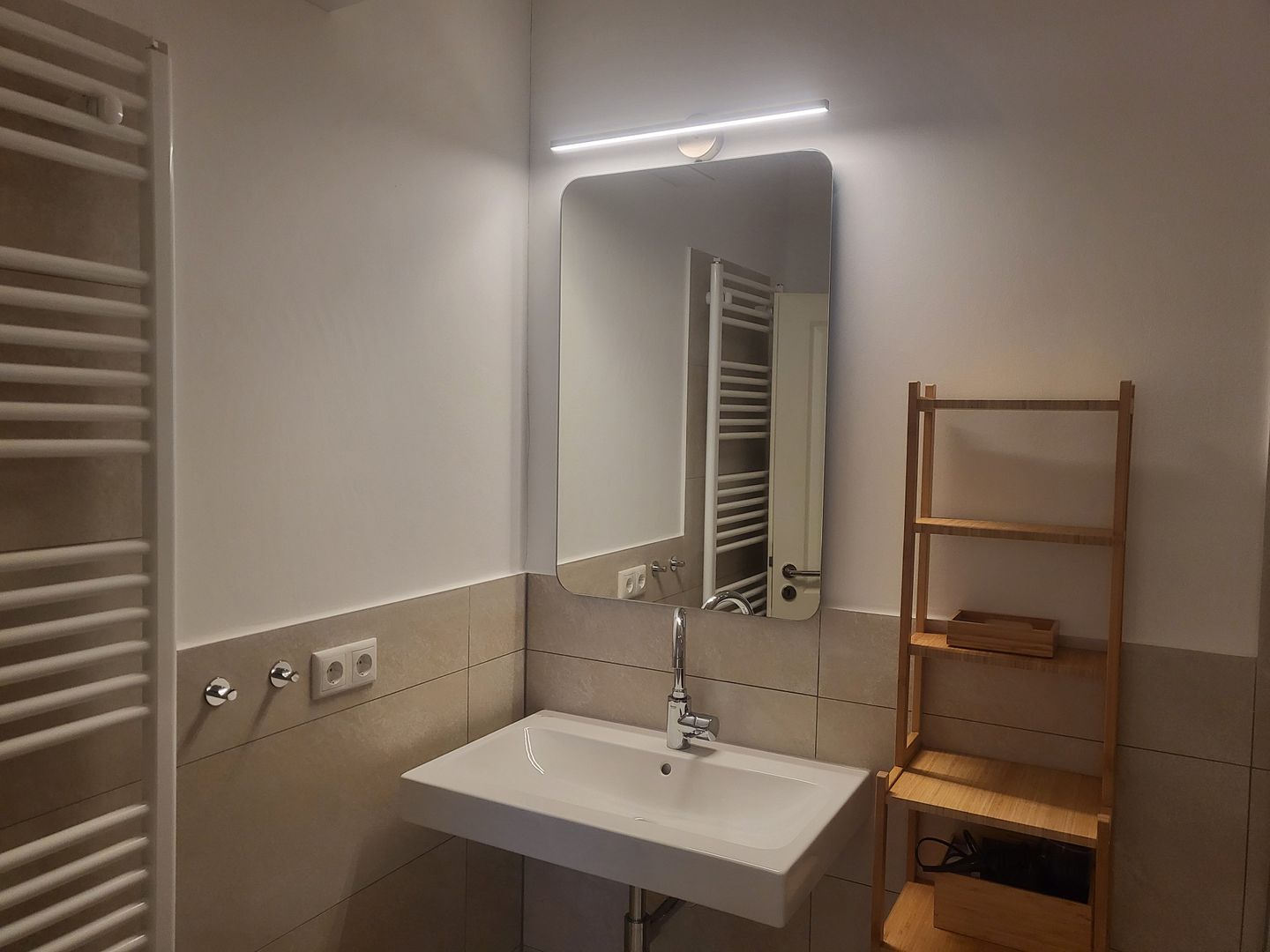Zwei moderne Badezimmer mit bodengleichen Duschen und Spiegeln sorgen für Komfort und Privatsphäre. Eines davon befindet sich im EG und das andere im OG. Die gemeinschaftlichen Waschmaschine und Trockner bieten Flexibilität bei längeren Aufenthalten und sind bequem nutzbar.
