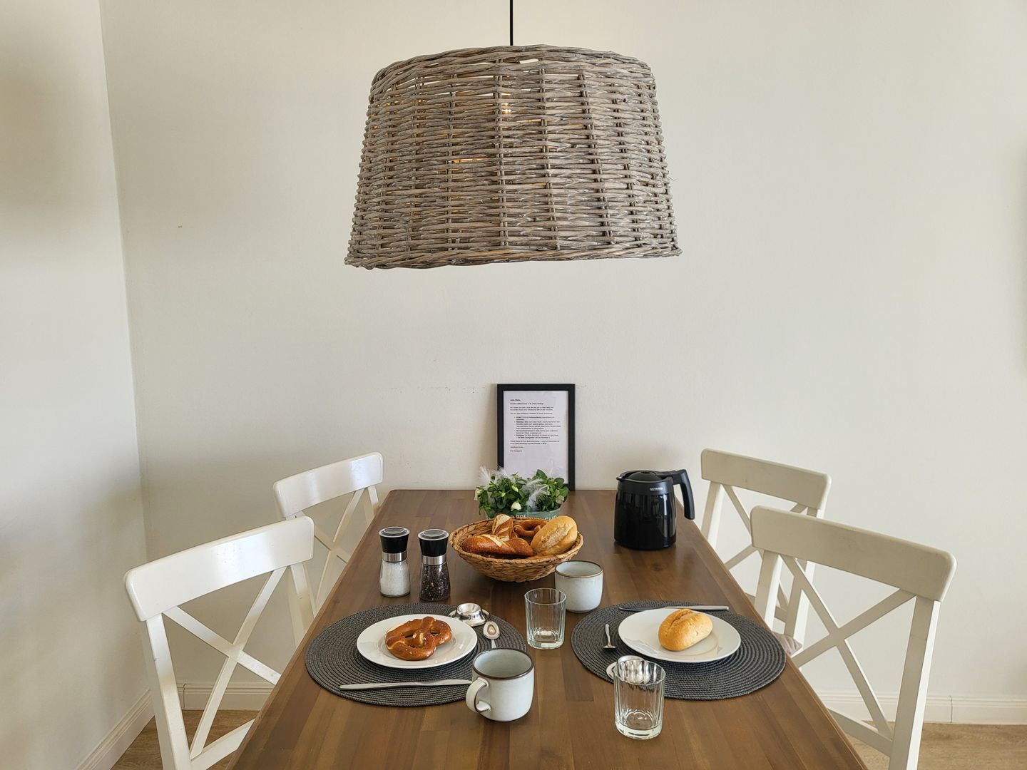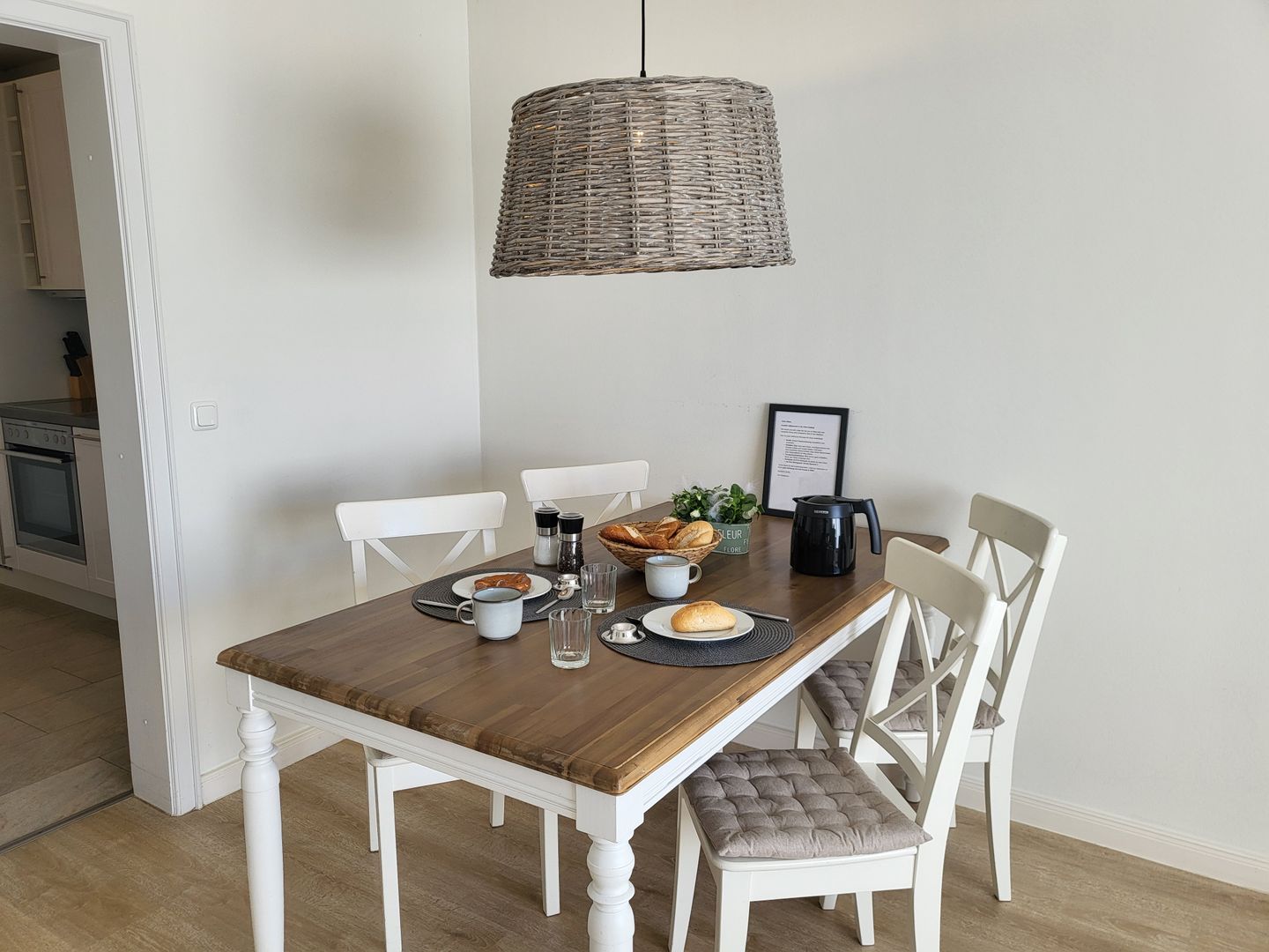 Der Wohnraum ist ausgestattet mit einer modernen, sehr komfortablen Schlafcouch, dem Esstisch für die ganze Familie und einem Korbsessel.