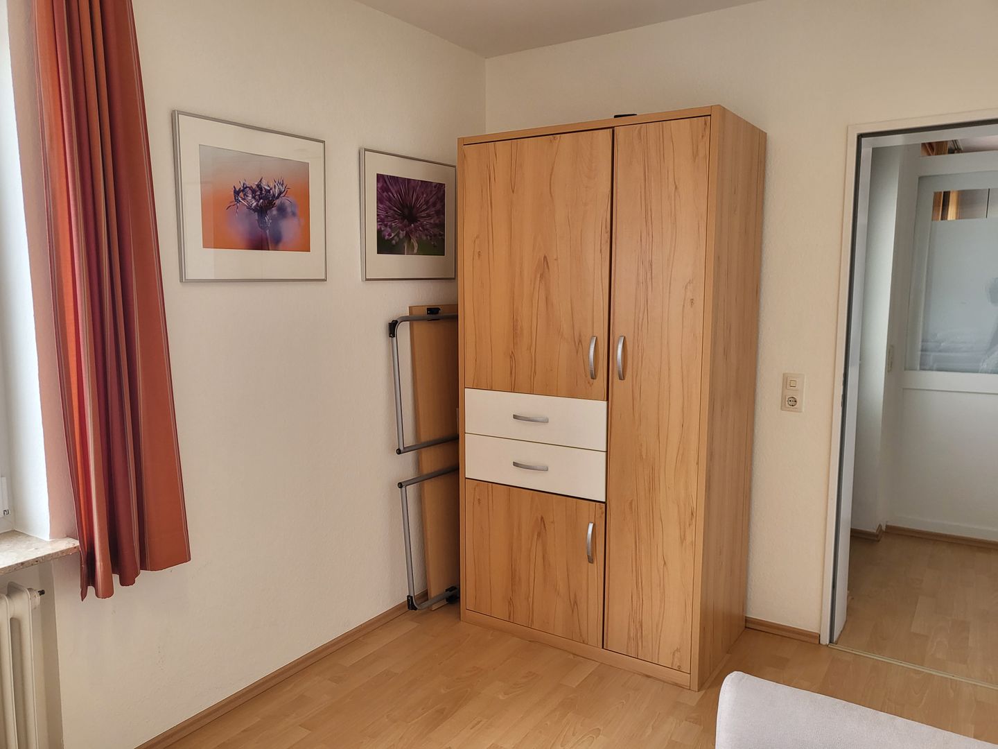 Die beiden Schlafzimmer der Ferienwohnung verfügen jeweils über einen geräumigen Kleiderschrank. Ein Schlafzimmer ist eingerichtet mit geräumigen 180x200cm Doppelbett, im zweiten steht ein Einzelbett zur Verfügung, das auch von Erwachsenen genutzt werden kann. Zur Ferienwohnung gehört ein geräumiges Duschbad mit WC. Dort gibt es einen Waschtrockner.